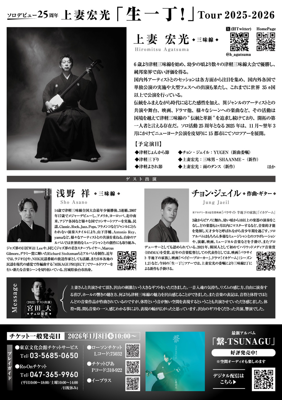 3/3(火) 18:30 開演(18:00 開場)東京文化会館 小ホール料金(税込)全席指定 一般 : 7,000円 U-25(25歳以下): 3,000円 小中学生 : 1,000円
