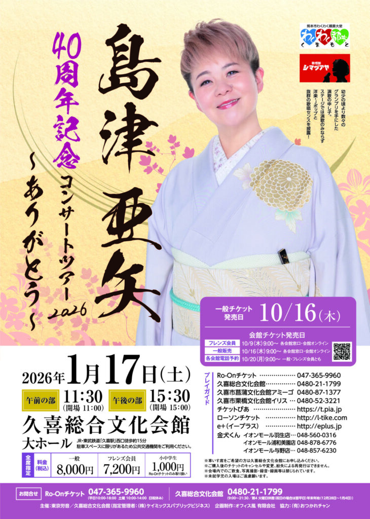 1/17(土) 11:30 / 15:30 開演(各回30分前 開場)久喜総合文化会館料金(税込)全席指定 : 8,000円