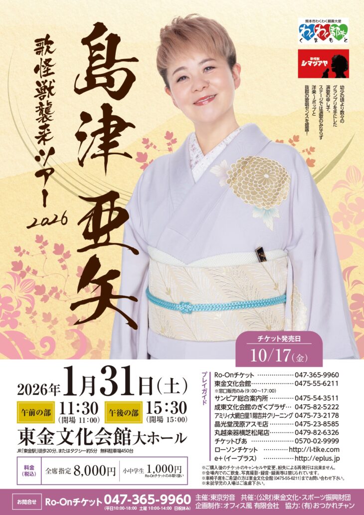 1/31(土) 11:30 / 15:30 開演(各回30分前 開場)東金文化会館 大ホール料金(税込)全席指定 : 8,000円